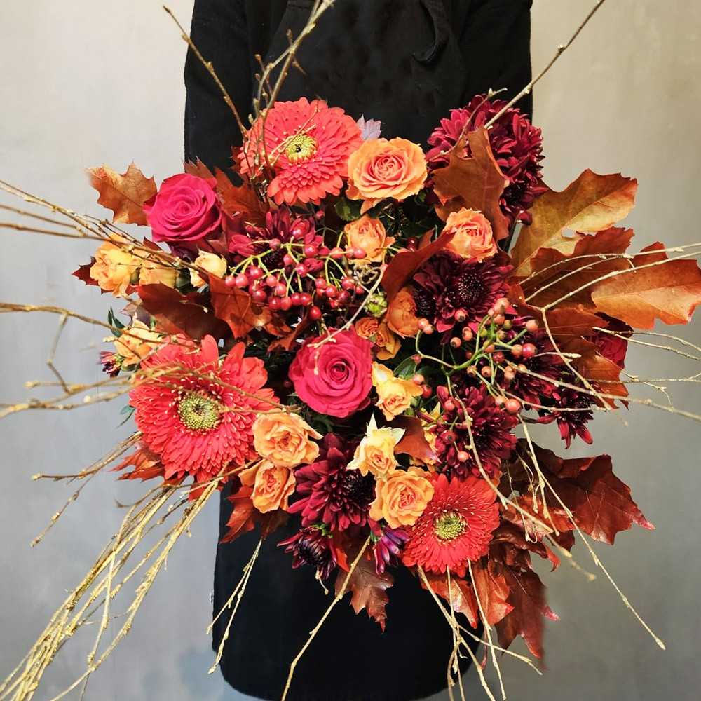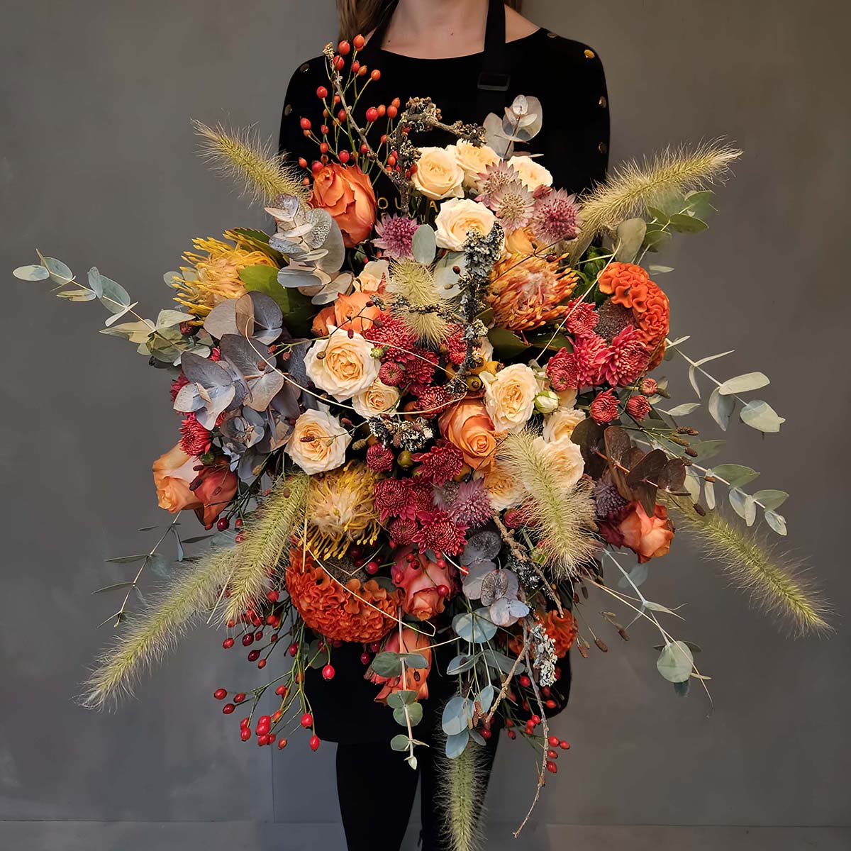 En automne, ce sont des farandoles de baies, de feuillages colorés, de fleurs aux tons chauds que nous transformons en œuvres d’art éphémères, romantiques ou modernes, mais toujours majestueuses.