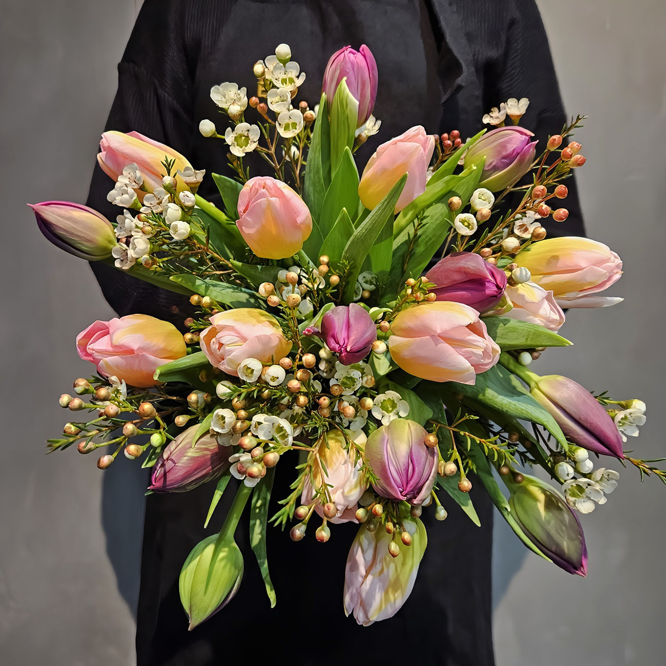 Au printemps, ce sont renoncules, délicates anémones, poétiques myosotis, muscaris et tulipes chamarrées qui se donnent rendez-vous dans nos ateliers, au sein de notre entreprise familiale.